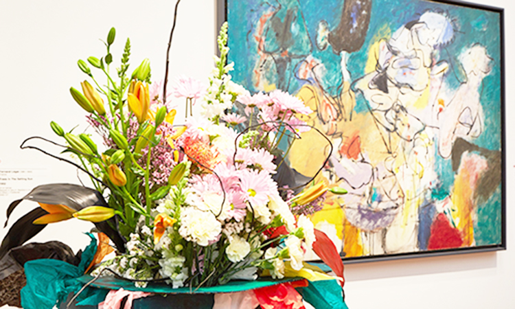We headed to the second floor, and as we traveled up the grand staircase, the noise level dramatically increased. It was evident that the majority of people at the museum were on the second floor to see Art in Bloom. When I reached the top, I was greeted by a vase full of flowers located in the exhibit of American art. Full of pink stargazer lilies blue roses, and purple iris, the flowers complemented the Jennie W. Mitchell Memorial Window well. The artwork, a stained-glass window that illuminated Mary, was created to inspire us to look up to God and our ancestors for guidance.