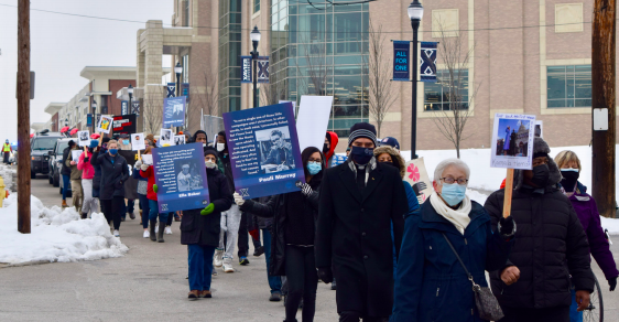 Norwood community members and families as well as Xavier students and faculty all parade down Cleneay Avenue, past the Health United Building, on their way to Bellarmine Chapel. They are trailed by a line of cars.
