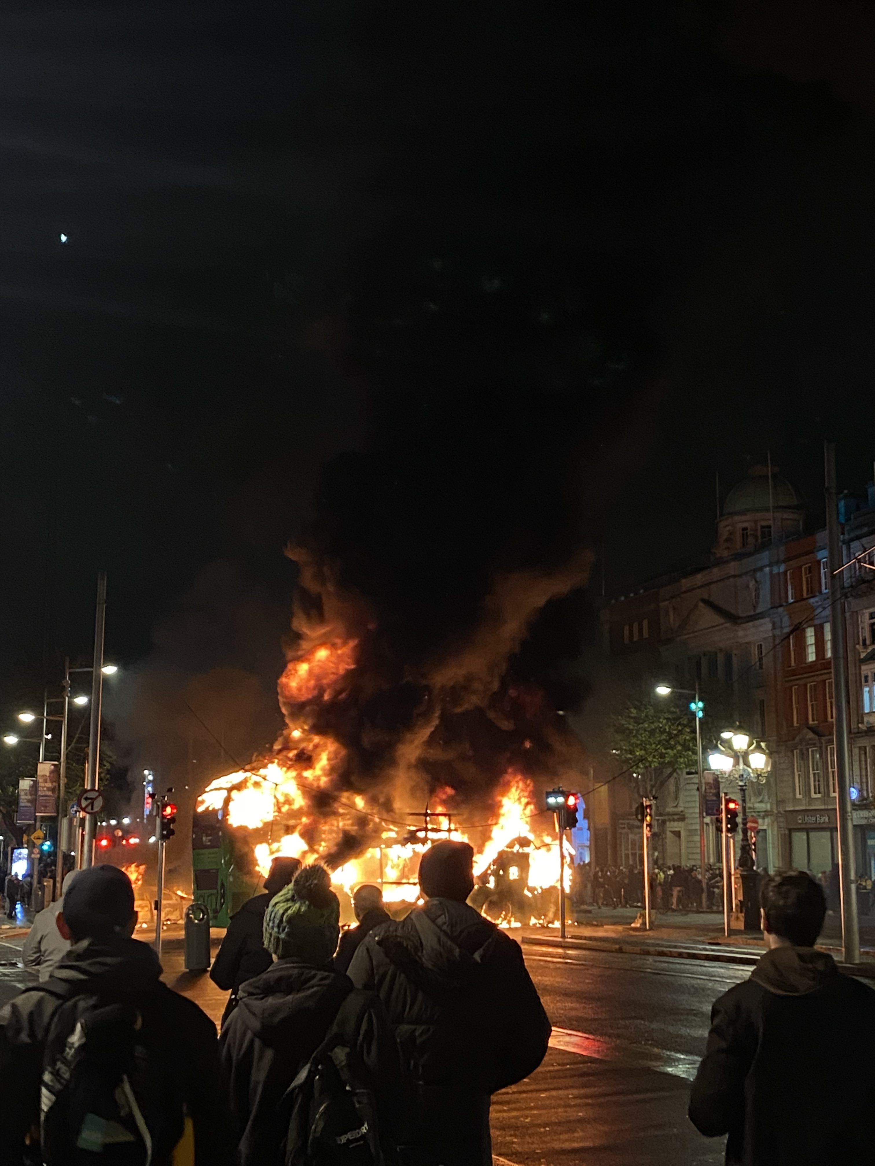 Riots in the city of Dublin damaged property and vehicles throughout the Irish capital, including three public buses.